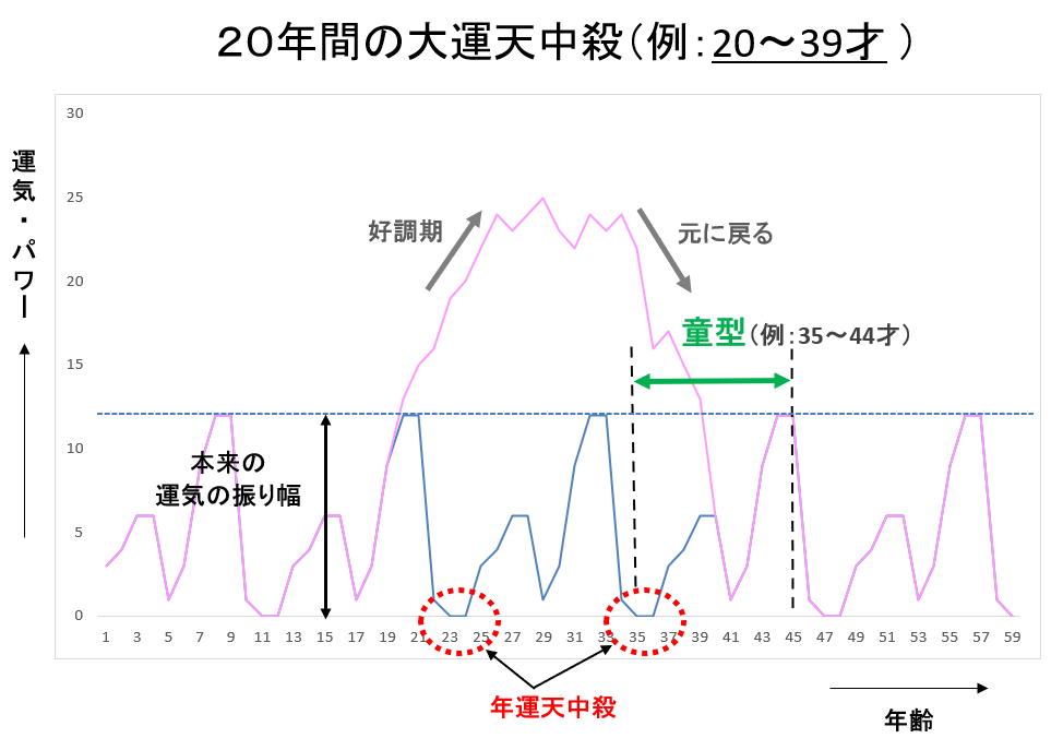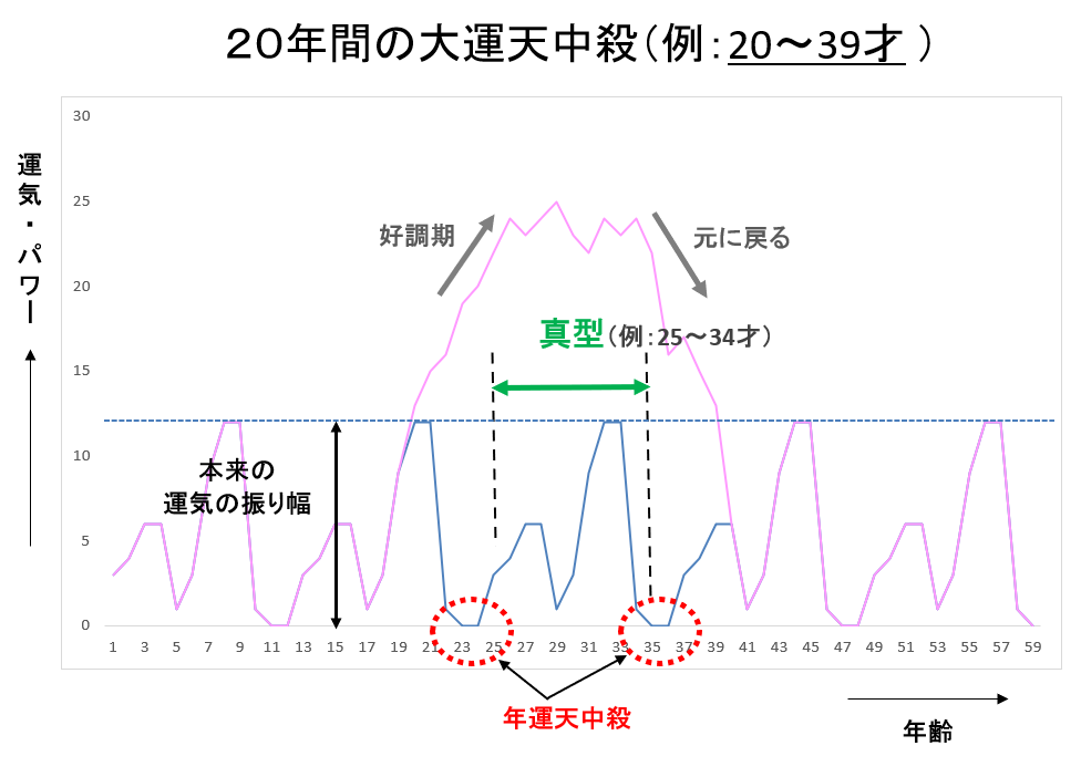 結果、第3、4旬に大運天中殺が移動し、正規の大運天中殺である第6、7旬を加えた、計40年間が大運天中殺になります。