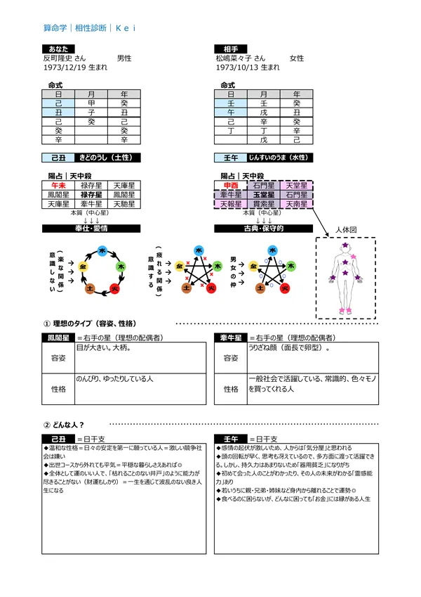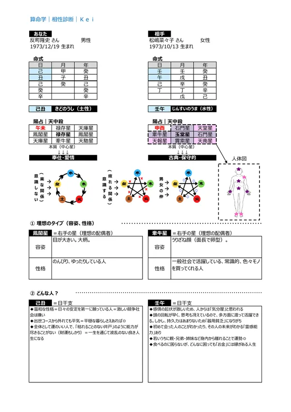 - A どんな人? → 本人を最も強く表す「日干支(60種類)」から、 お互いの長所短所を理解 した上で、お付き合いできます