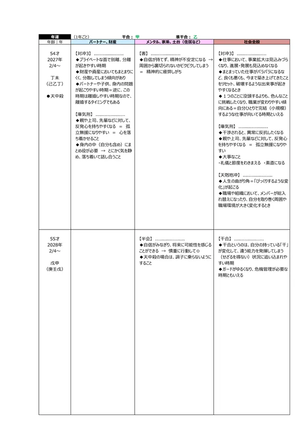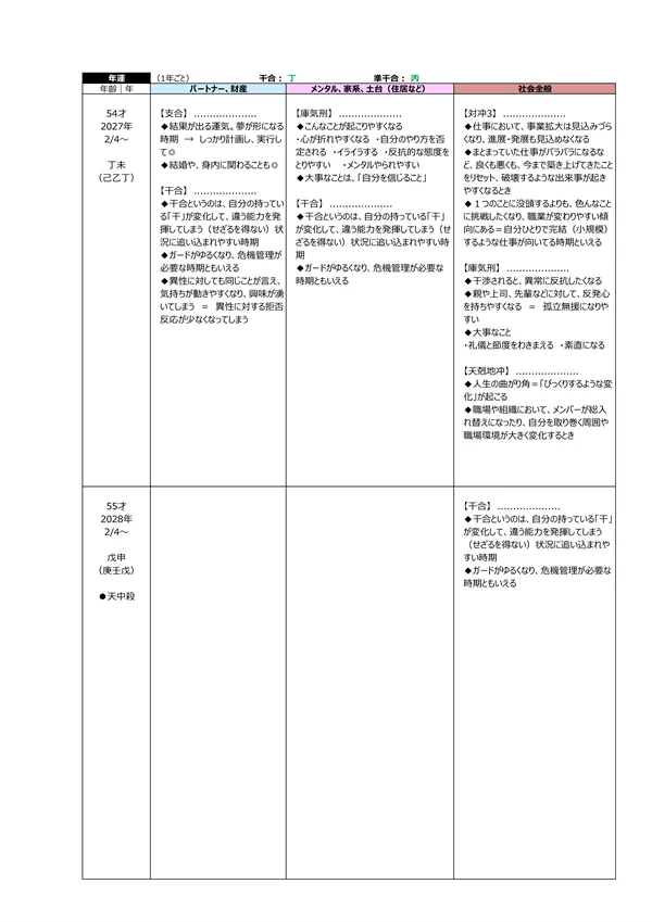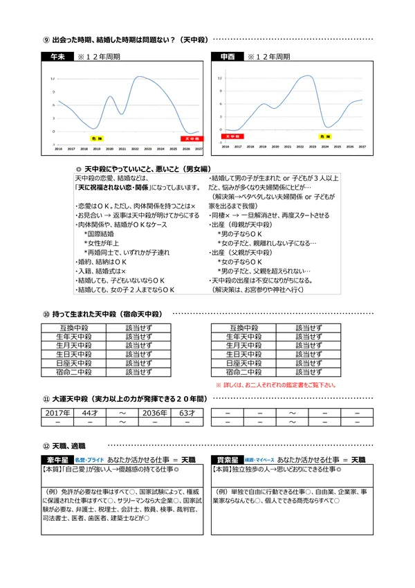 - S 浮気体質? → パートナーが異性にモテる宿命にあるかを知ることで、相手の浮気を未然に防止することが可能になります。判断材料は2つ。中年期・晩年期に「天恍星」があるか?もう一つは、「偏夫・偏妻」が複数人いるか?これらに該当する場合は、「自然に異性を惹きつけてしまう人」ということになります(仕方がないことです)