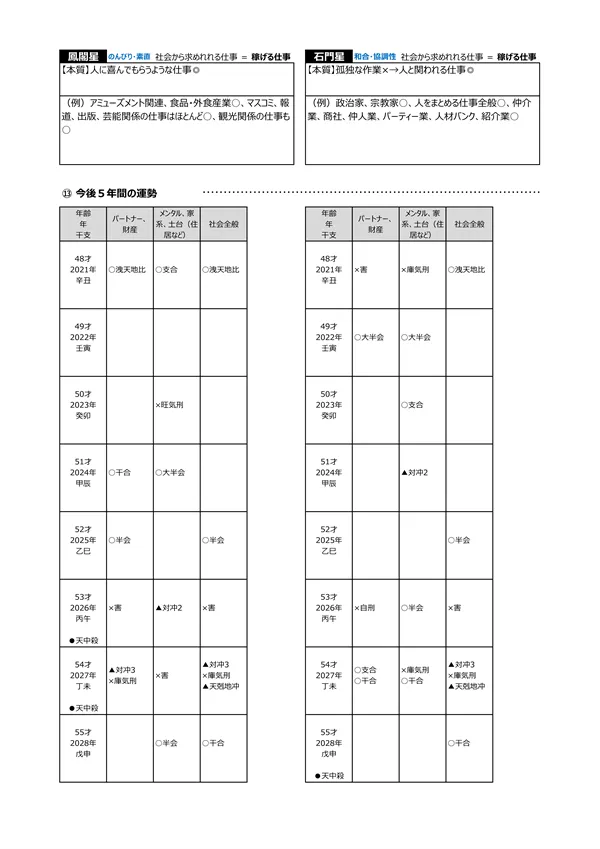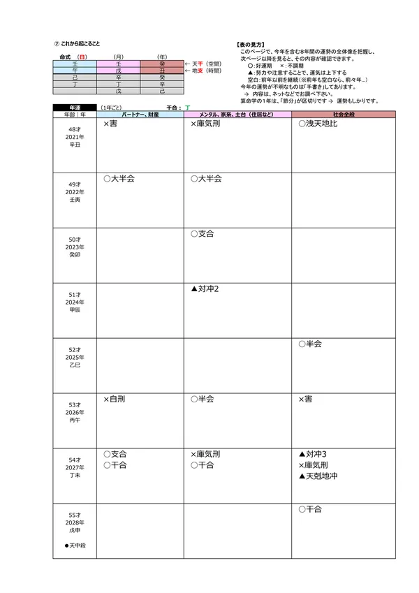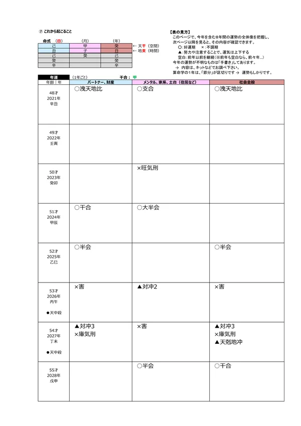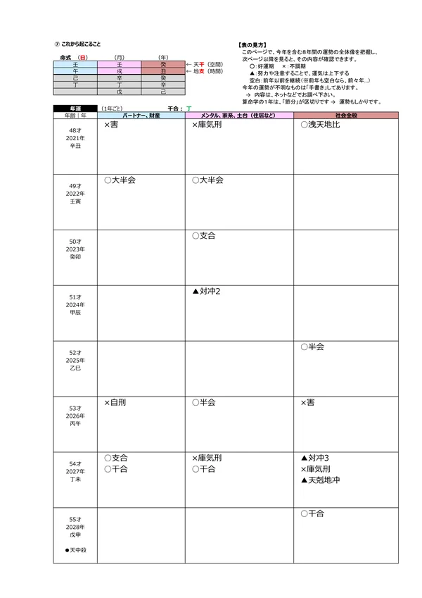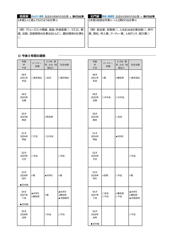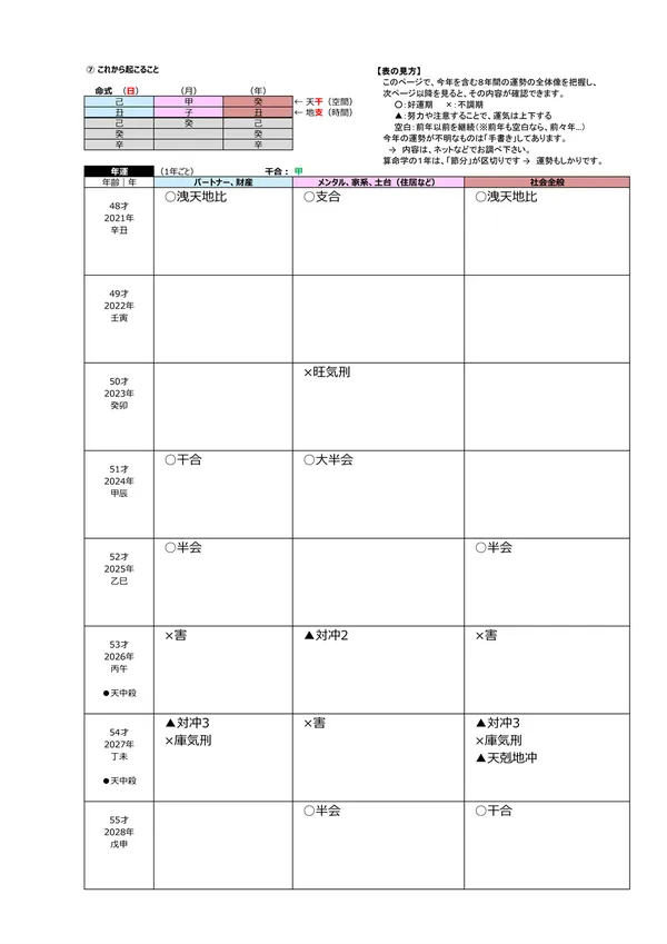- L 今後5年間の運勢 → 自分の命式(1ページ目)と、毎年の「干支」がどのような影響を及ぼすかによって、運勢を予測できます。この表によって全体像(○:良い ▲:本人次第 ×:悪い)が分かります。また、「空白」の箇所は「前年、前々年」の運勢を継続するように見ていきます ※それぞれの「運勢」の内容は、個々の鑑定書で見ることができます。