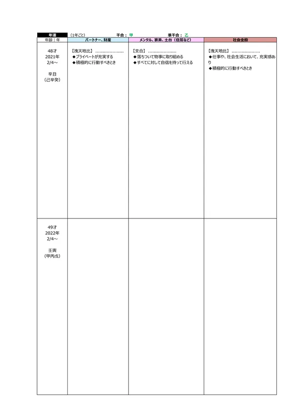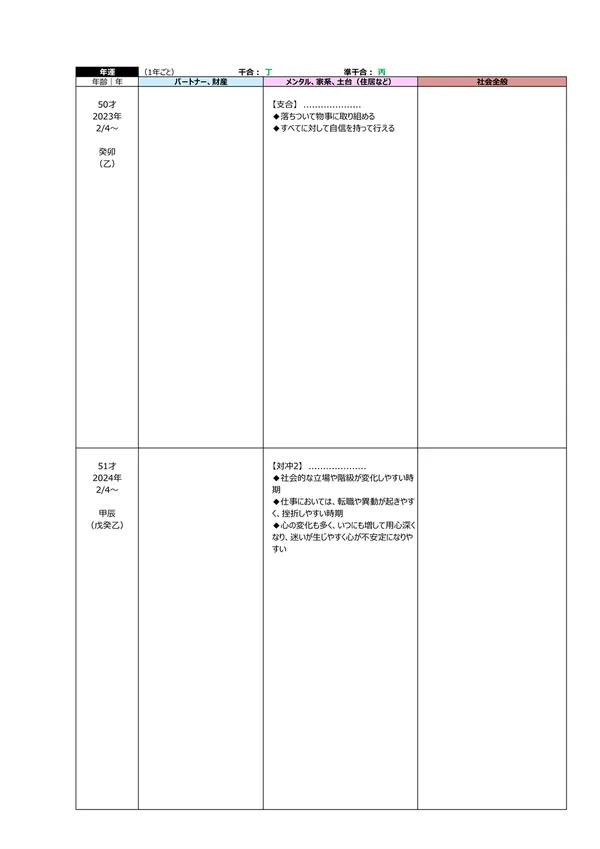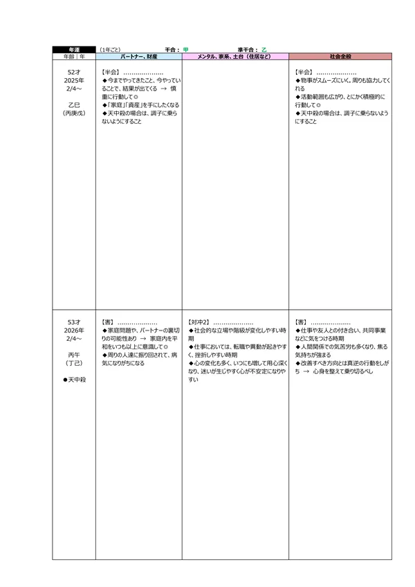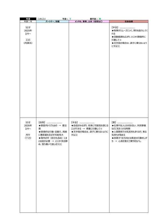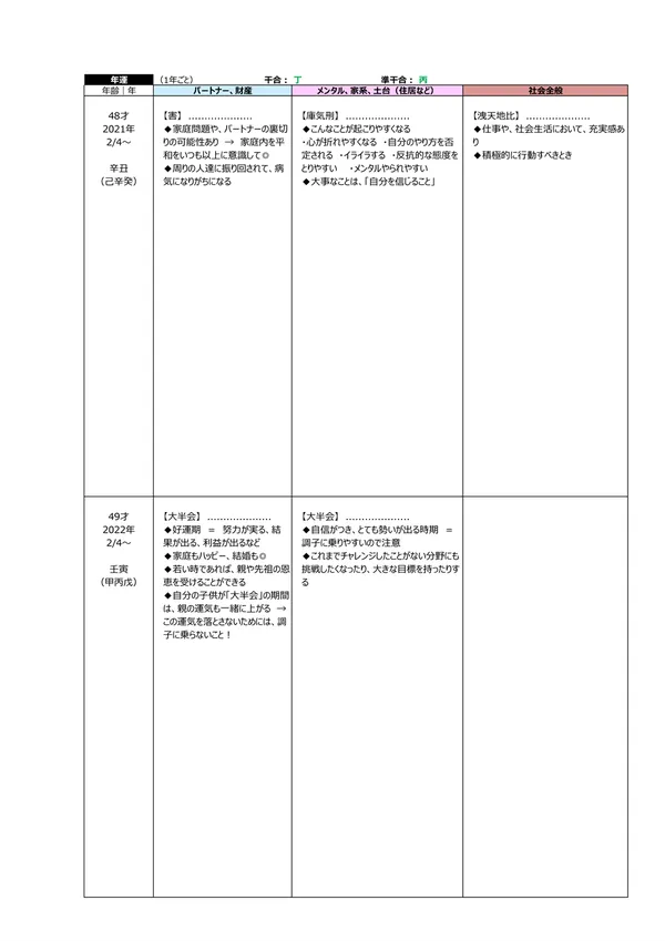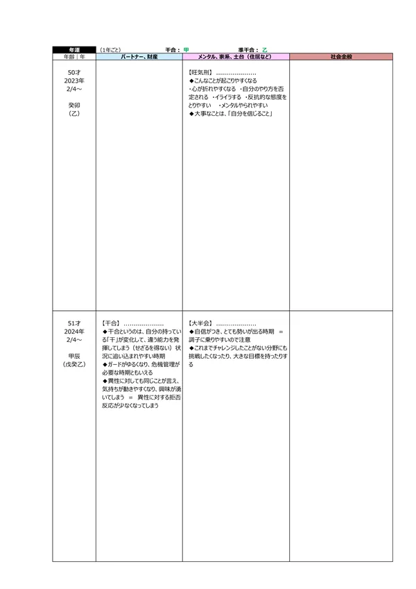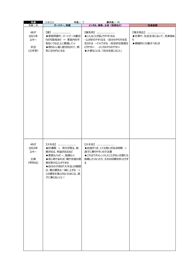 - L 今後5年間の運勢 → 自分の命式(1ページ目)と、毎年の「干支」がどのような影響を及ぼすかによって、運勢を予測できます。この表によって全体像(○:良い ▲:本人次第 ×:悪い)が分かります。また、「空白」の箇所は「前年、前々年」の運勢を継続するように見ていきます ※それぞれの「運勢」の内容は、個々の鑑定書で見ることができます。