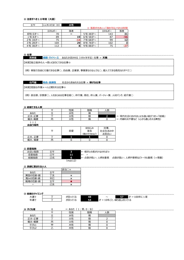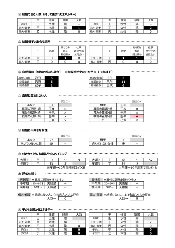 - M 結婚できる人数 → 生まれながらに結婚のエネルギーが有るかを知ることができます。「0」の人は、「1人でいた方が輝ける人」という見方をします。結婚後、違和感を感じたら、2人のために「早めのリスタート」をするか、家庭内に「1人になれる場所」を作ったりする必要があります ※「偏夫・偏妻」とは籍を入れない「内縁の夫・妻」などを示します 説明ページ