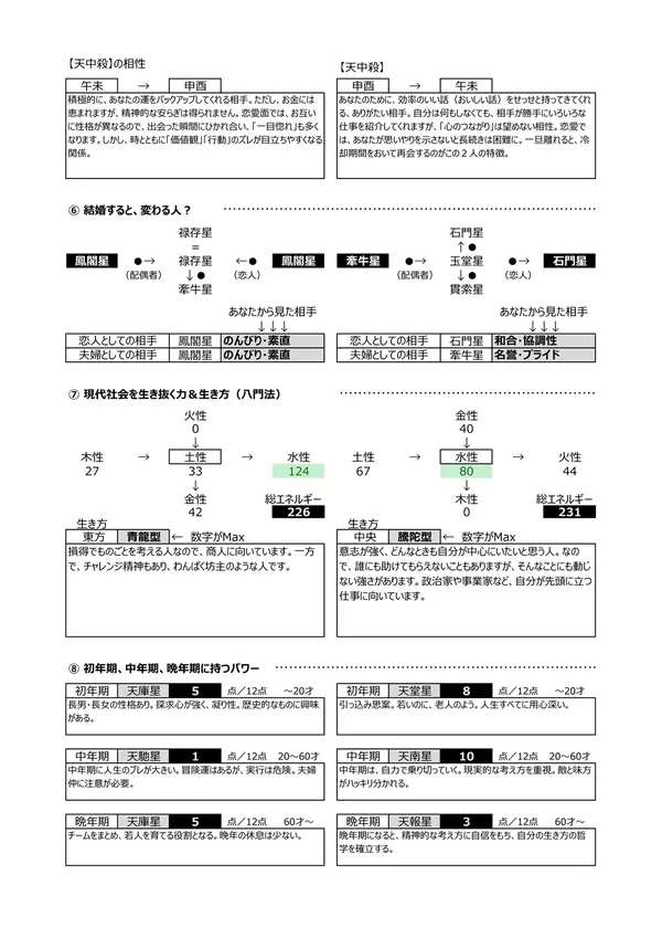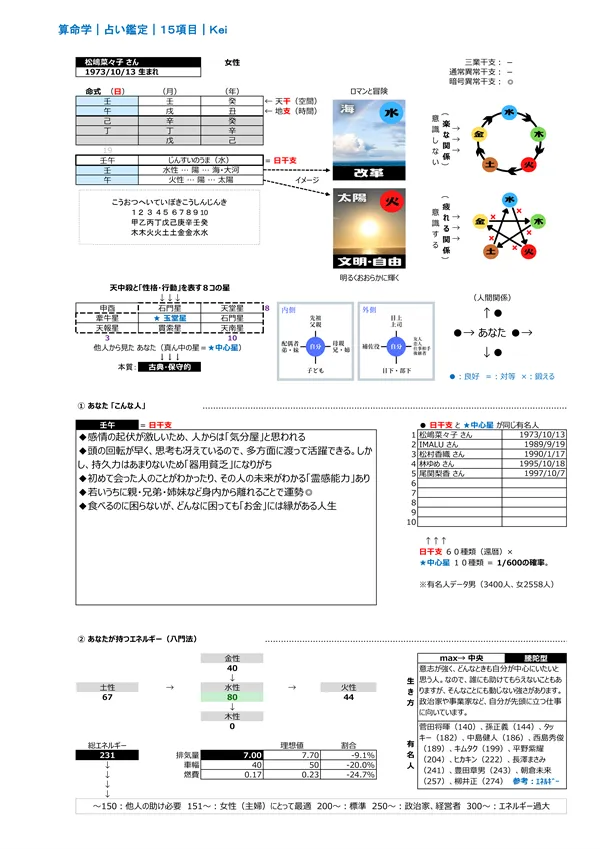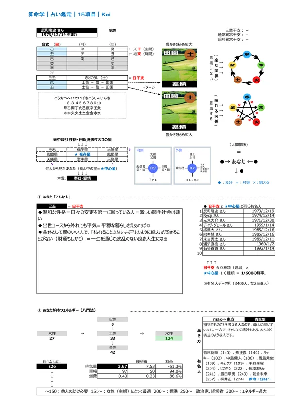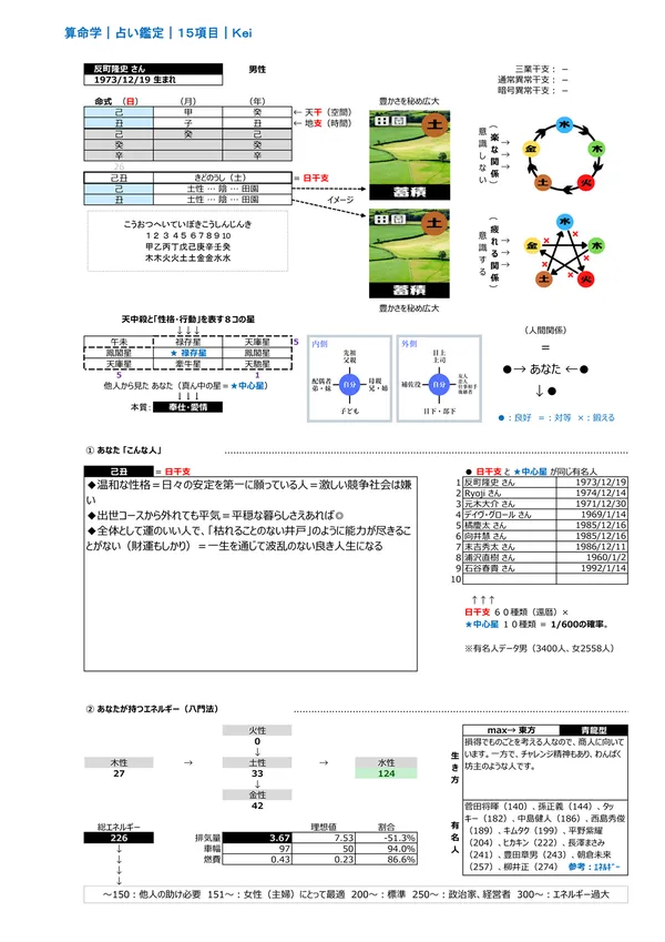 - F 現代社会を生き抜く力&生き方 → 宿命として持つエネルギー(バイタリティ)を知って、力の活かし方を知ることができます。また、点数分布によって「生き方」が分かります ※頭を使う(150未満)、主婦に最適(150〜200)、標準(200〜250)、経営者・政治家(250〜)、気力を発散する仕事に向く(300〜)。 男女のパワーバランスはとても重要です。 説明ページ