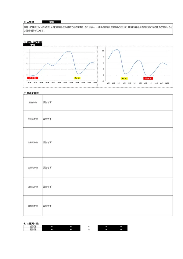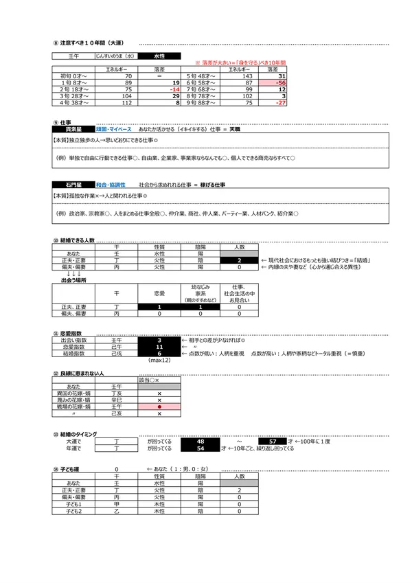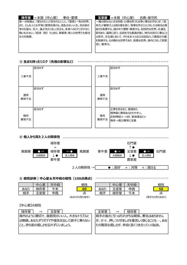 - B 生まれ持ったリスク → 「先祖から悪影響を受けてしまう」「他人に理解されない」「霊感が強い」など、宿命として背負ったリスク を知ることができます