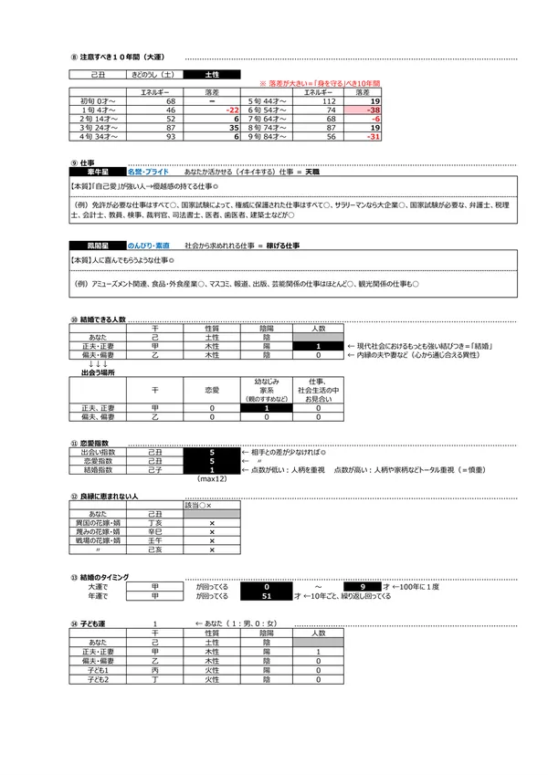- ㉑ 子どもを授かるエネルギー → 命式(1ページ)を見ると、子どもができやすい体質なのか、子どもが生まれた後、なつく子どもになるのかなどを知ることができます 説明ページ