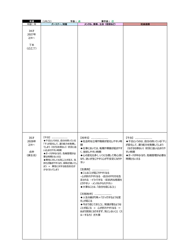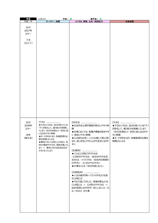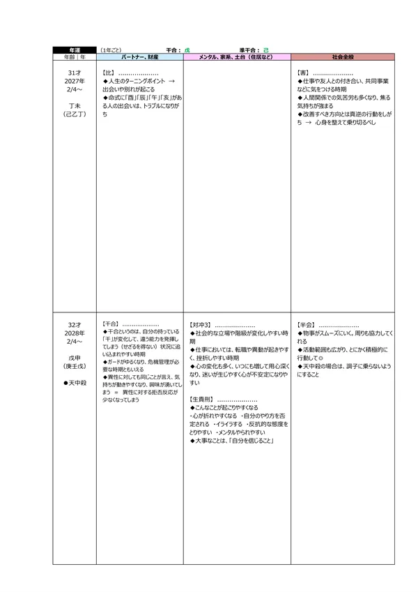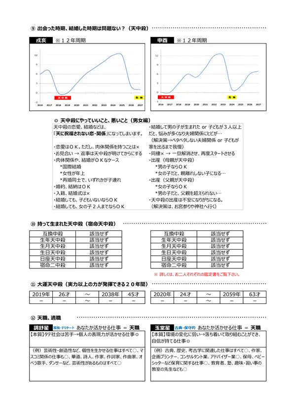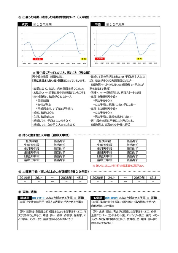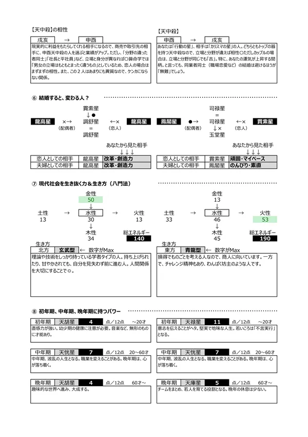 - S 浮気体質? → パートナーが異性にモテる宿命にあるかを知ることで、相手の浮気を未然に防止することが可能になります。判断材料は2つ。中年期・晩年期に「天恍星」があるか?もう一つは、「偏夫・偏妻」が複数人いるか?これらに該当する場合は、「自然に異性を惹きつけてしまう人」ということになります(仕方がないことです)