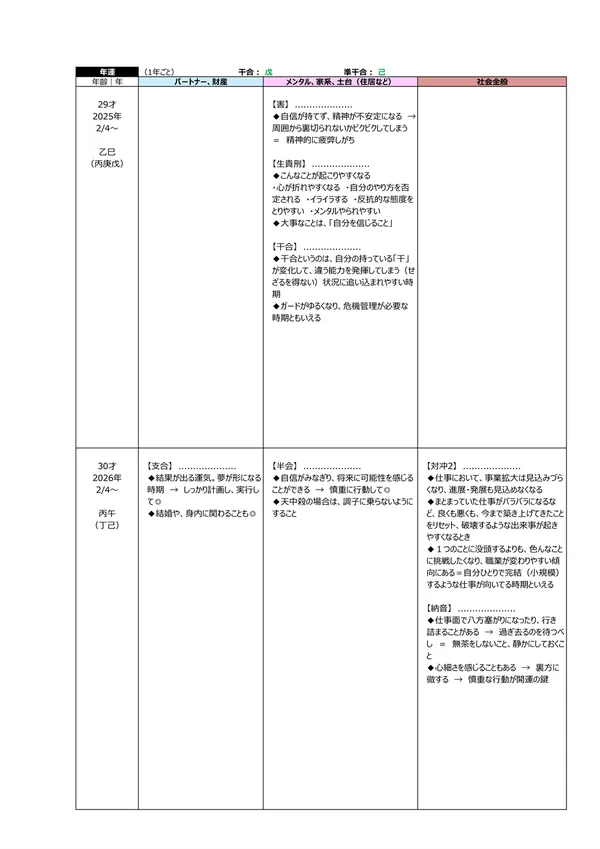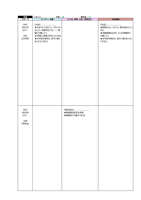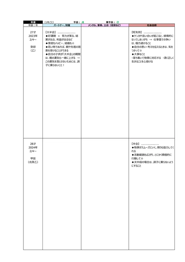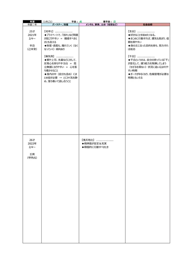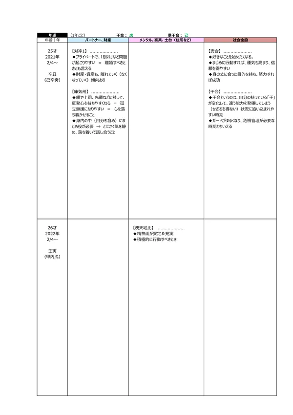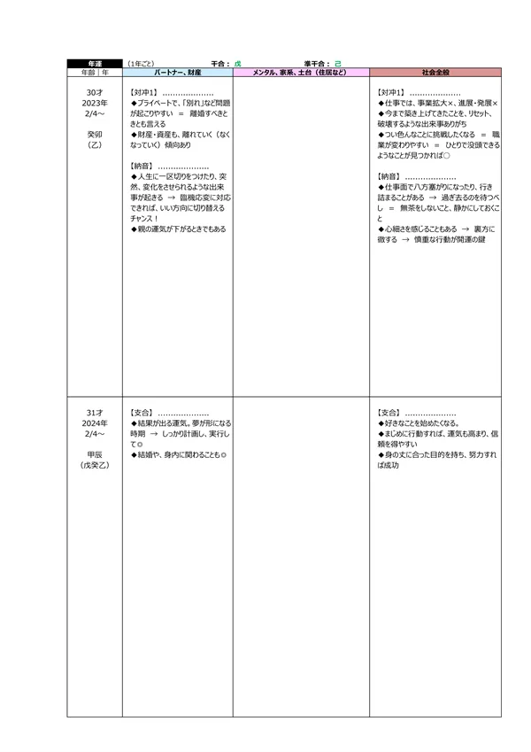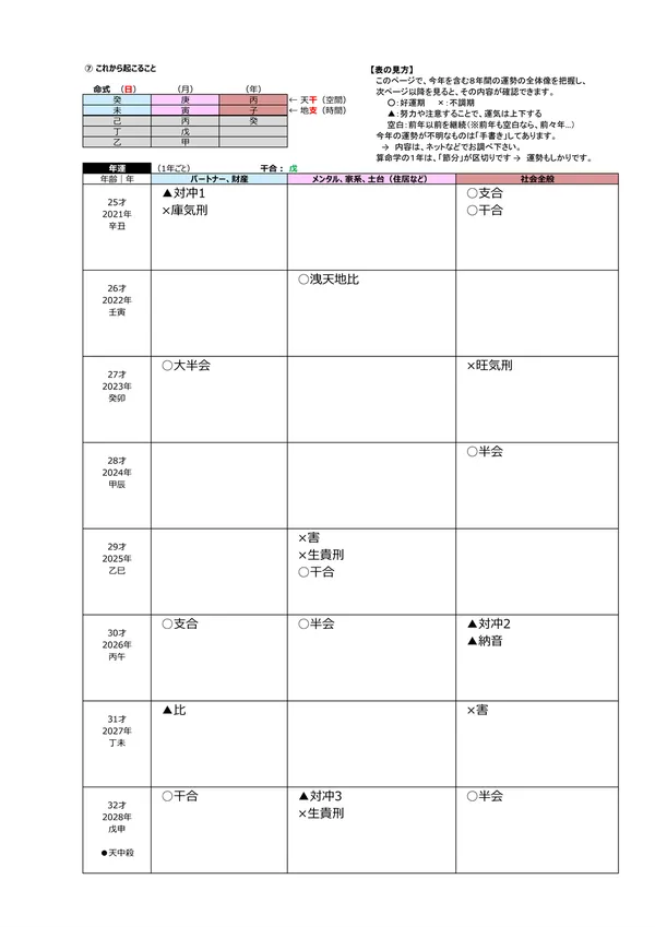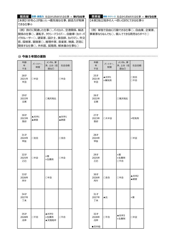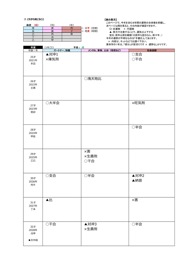 - L 今後5年間の運勢 → 自分の命式(1ページ目)と、毎年の「干支」がどのような影響を及ぼすかによって、運勢を予測できます。この表によって全体像(○:良い ▲:本人次第 ×:悪い)が分かります。また、「空白」の箇所は「前年、前々年」の運勢を継続するように見ていきます ※それぞれの「運勢」の内容は、個々の鑑定書で見ることができます。
