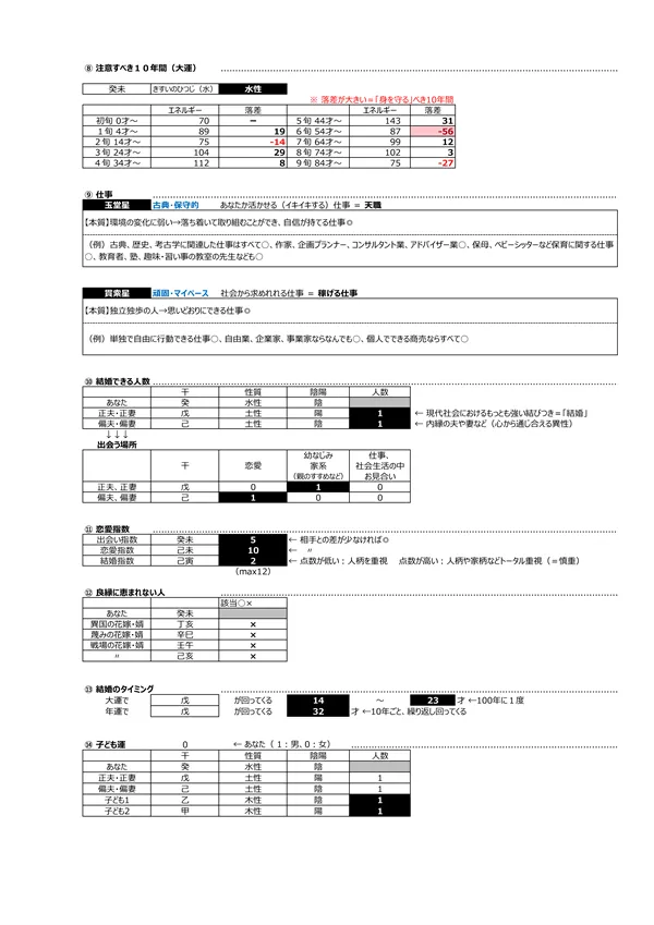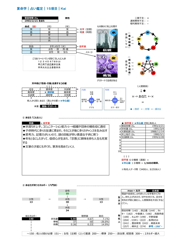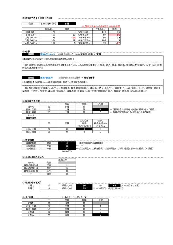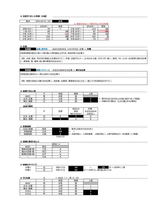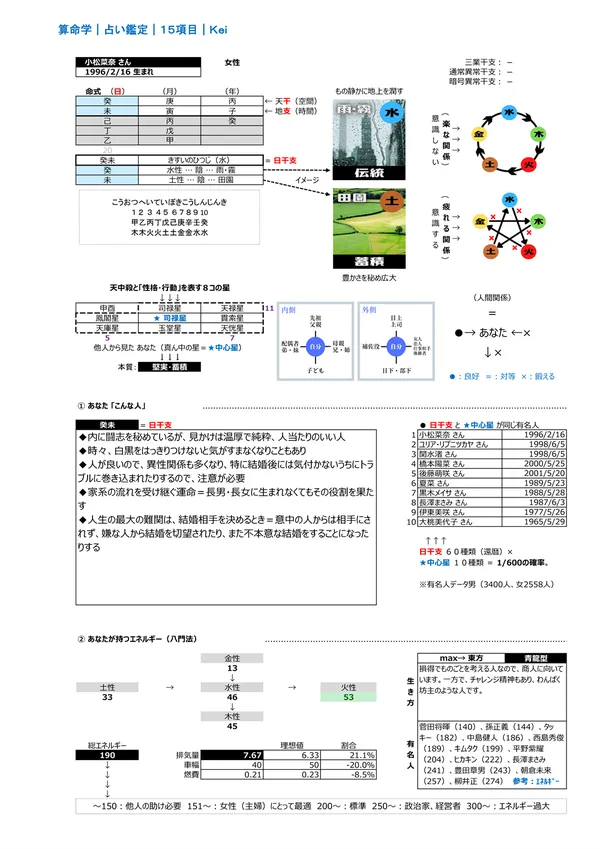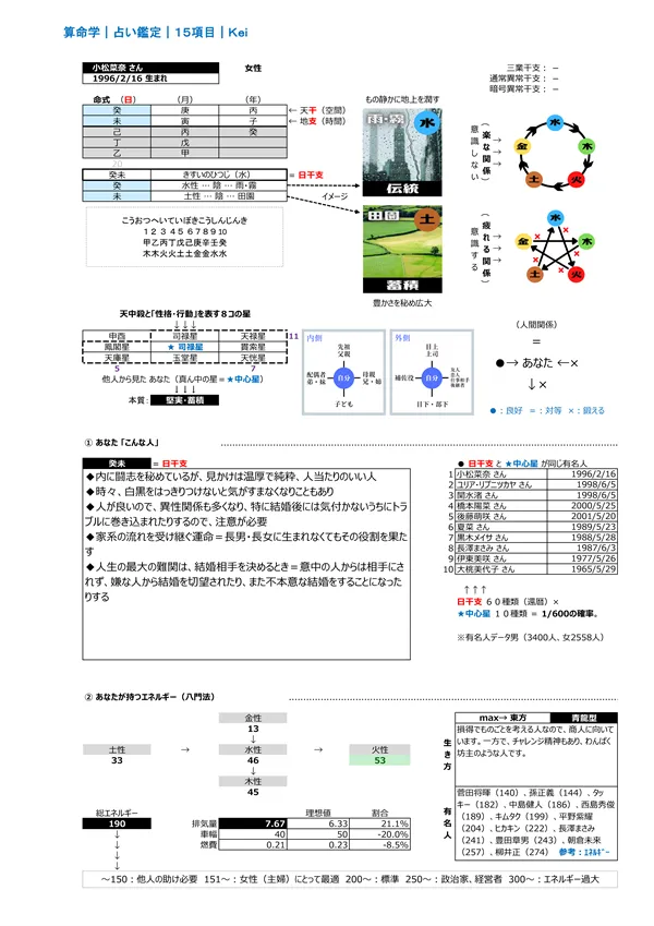 - F 現代社会を生き抜く力&生き方 → 宿命として持つエネルギー(バイタリティ)を知って、力の活かし方を知ることができます。また、点数分布によって「生き方」が分かります ※頭を使う(150未満)、主婦に最適(150〜200)、標準(200〜250)、経営者・政治家(250〜)、気力を発散する仕事に向く(300〜)。 男女のパワーバランスはとても重要です。 説明ページ