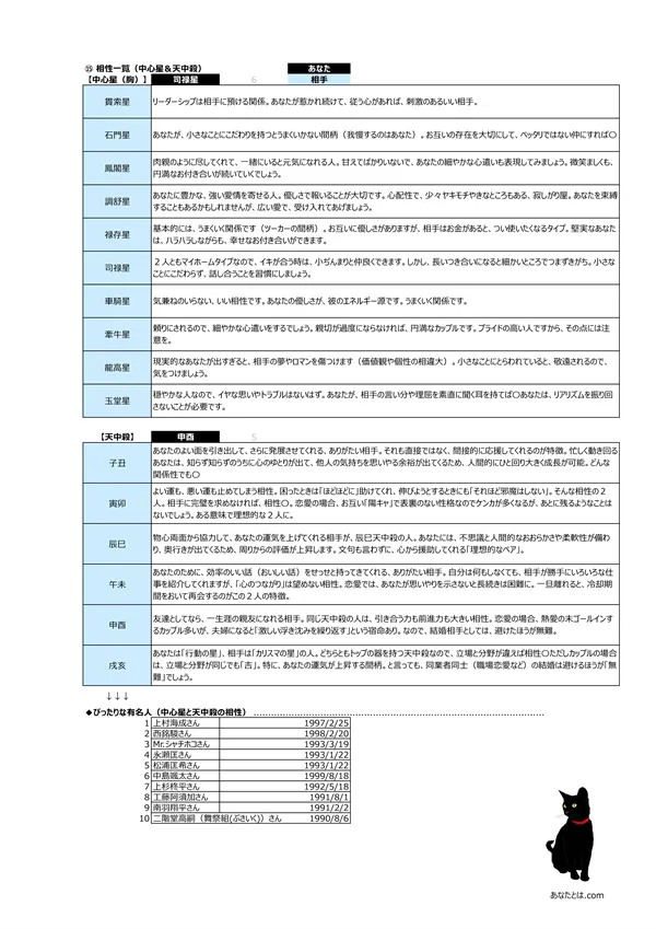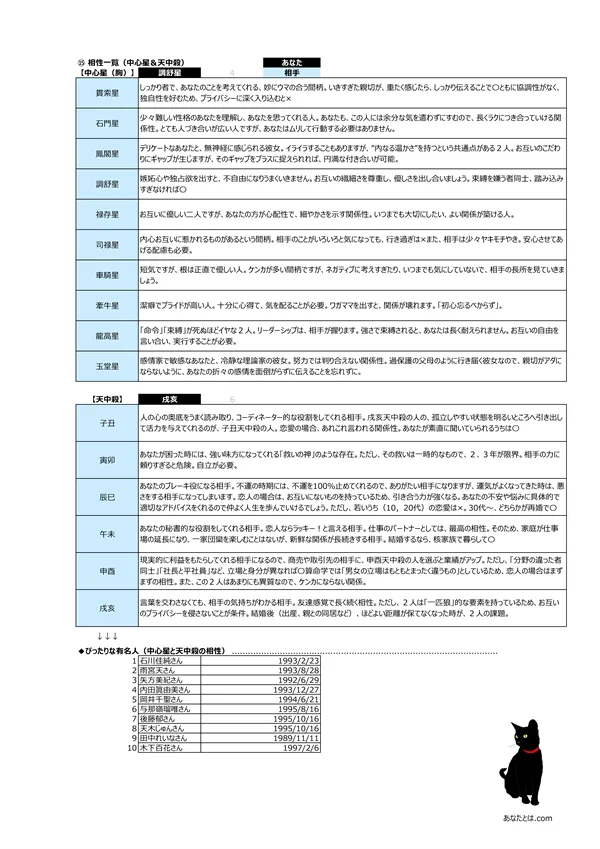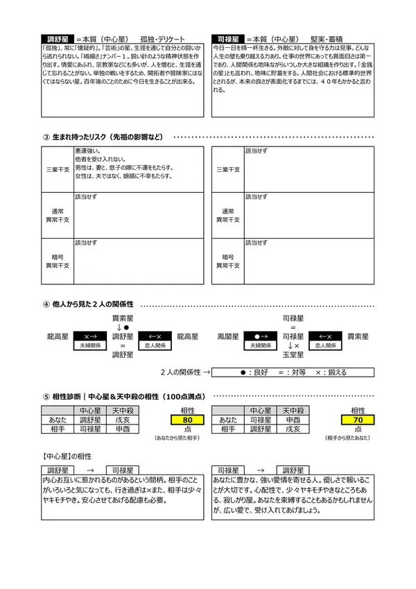 - D 相性診断 → 「中心星」と「天中殺」から相性が分かります ※相性が良過ぎると、何もかも分かり合える反面、「何でも見透かされてしまう」 息の抜けない関係にもなりかねません…