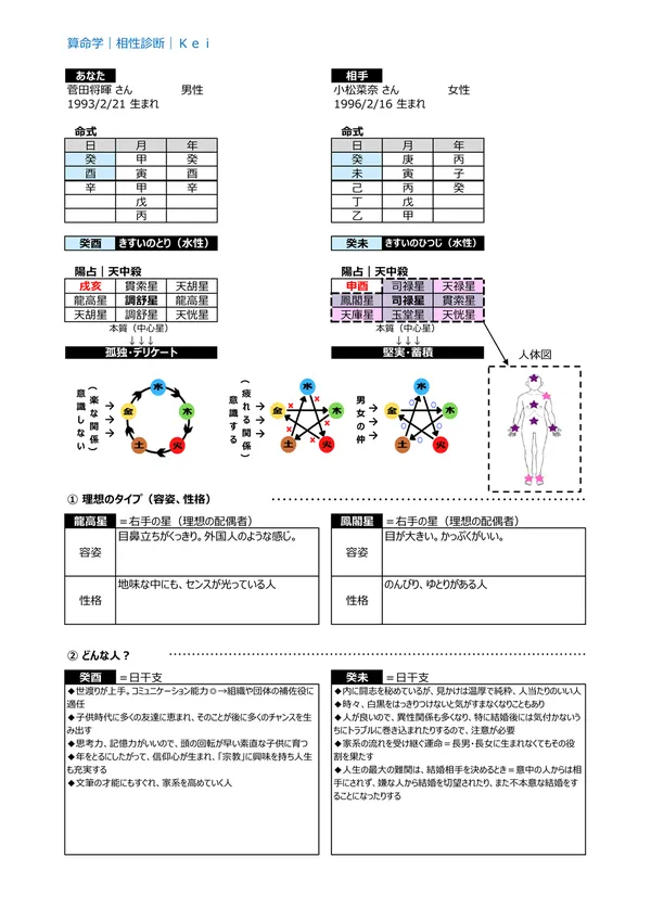- A どんな人? → 本人を最も強く表す「日干支(60種類)」から、 お互いの長所短所を理解 した上で、お付き合いできます
