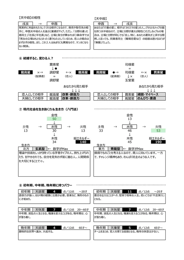 - E 結婚すると変わる人? → 「優しかった人が、亭主関白にかわる」「頑固だった人が、子どもみたいになった」などがわかります ※この関係性は、自分が作り上げるという見方をします