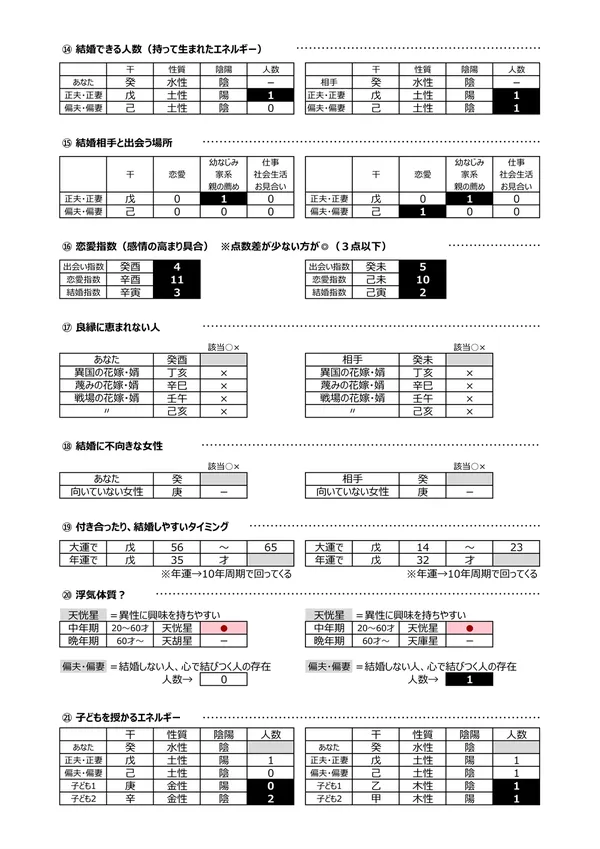 - M 結婚できる人数 → 生まれながらに結婚のエネルギーが有るかを知ることができます。「0」の人は、「1人でいた方が輝ける人」という見方をします。結婚後、違和感を感じたら、2人のために「早めのリスタート」をするか、家庭内に「1人になれる場所」を作ったりする必要があります ※「偏夫・偏妻」とは籍を入れない「内縁の夫・妻」などを示します 説明ページ