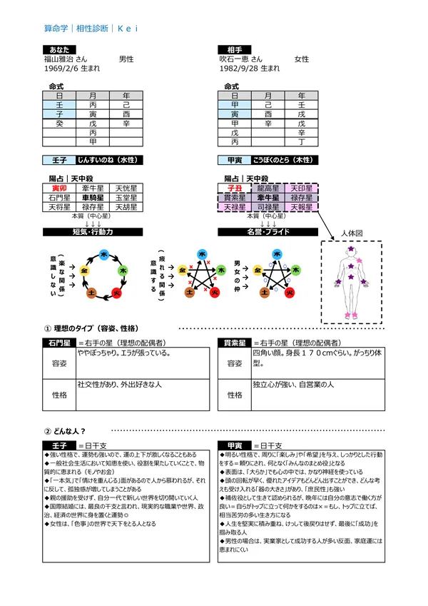 - A どんな人? → 本人を最も強く表す「日干支(60種類)」から、 お互いの長所短所を理解 した上で、お付き合いできます