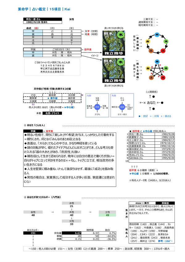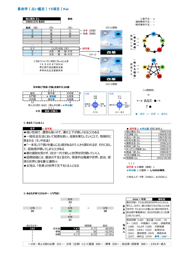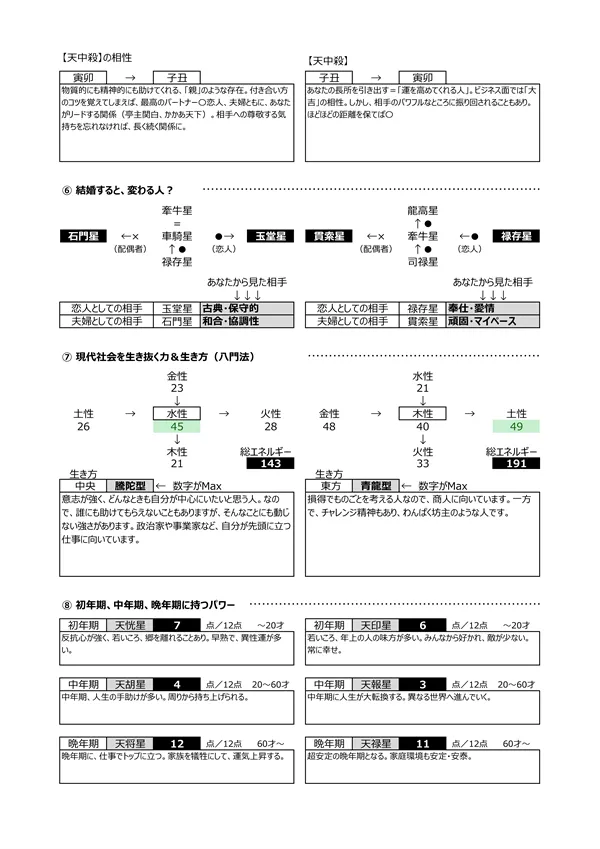 - F 現代社会を生き抜く力&生き方 → 宿命として持つエネルギー(バイタリティ)を知って、力の活かし方を知ることができます。また、点数分布によって「生き方」が分かります ※頭を使う(150未満)、主婦に最適(150〜200)、標準(200〜250)、経営者・政治家(250〜)、気力を発散する仕事に向く(300〜)。 男女のパワーバランスはとても重要です。 説明ページ