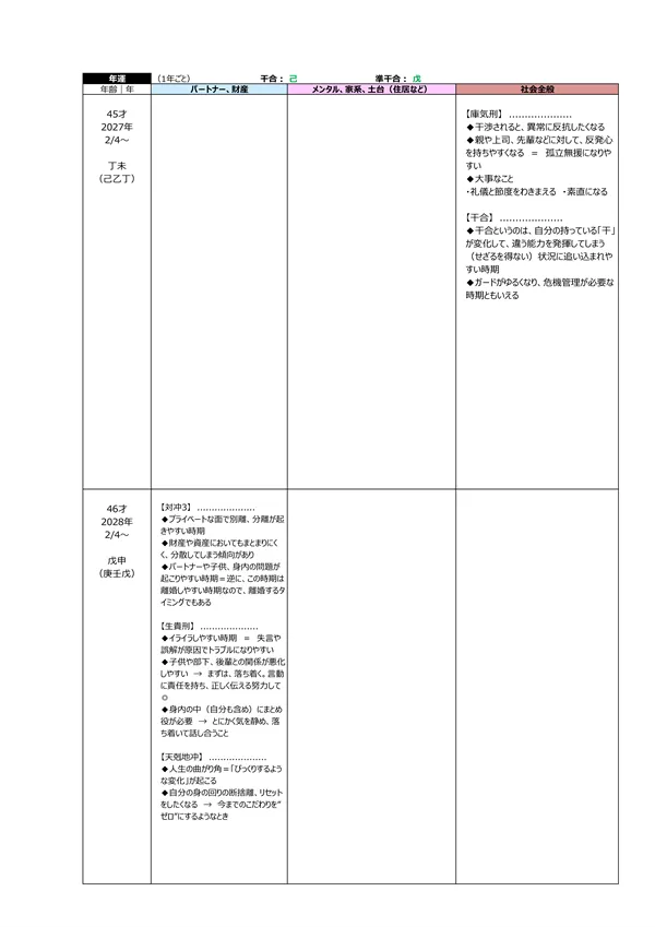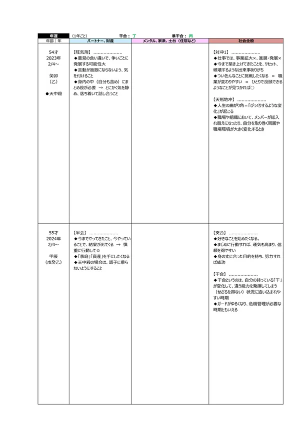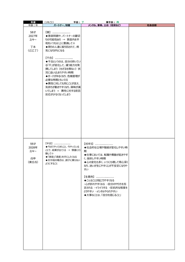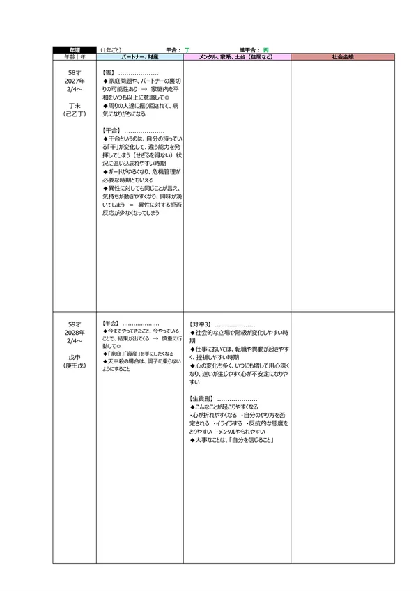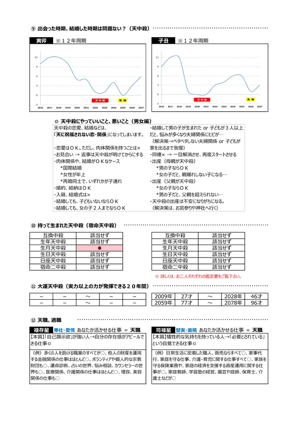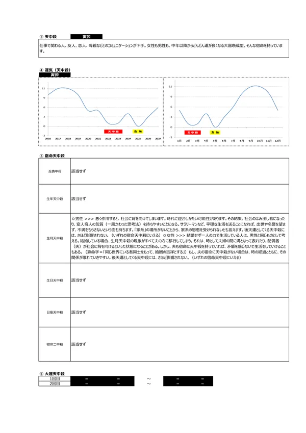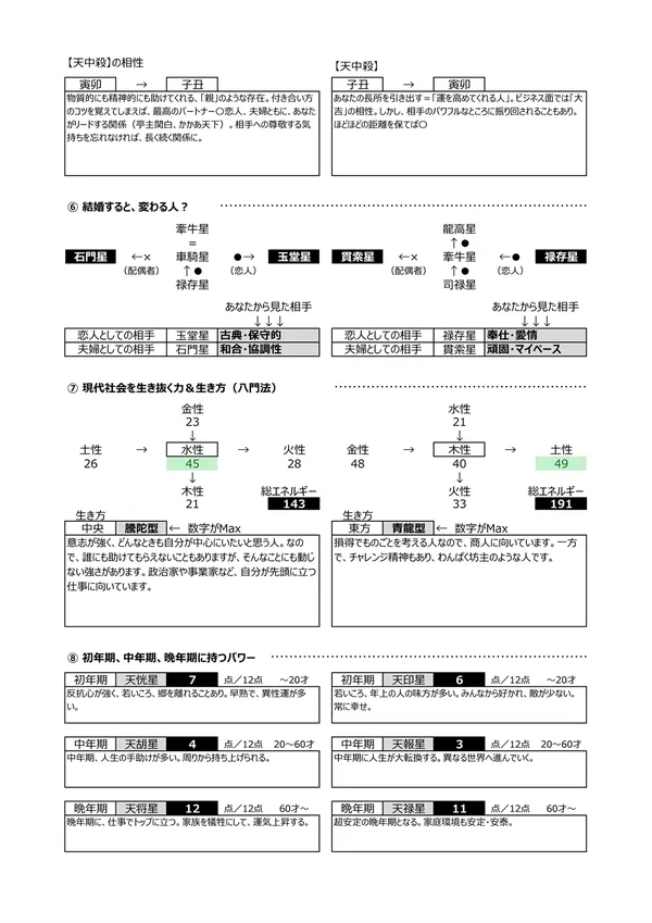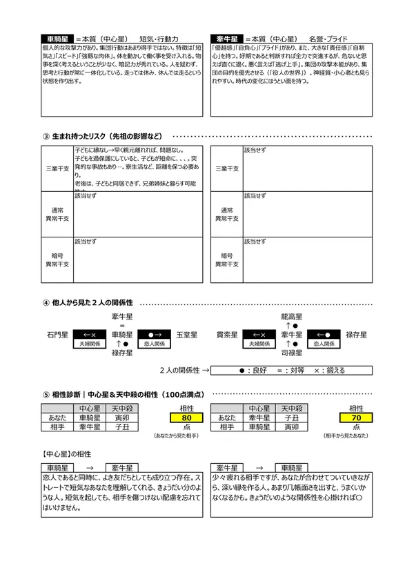 - S 浮気体質? → パートナーが異性にモテる宿命にあるかを知ることで、相手の浮気を未然に防止することが可能になります。判断材料は2つ。中年期・晩年期に「天恍星」があるか?もう一つは、「偏夫・偏妻」が複数人いるか?これらに該当する場合は、「自然に異性を惹きつけてしまう人」ということになります(仕方がないことです)