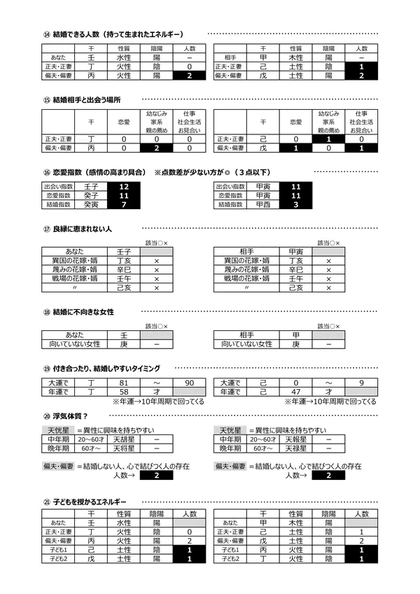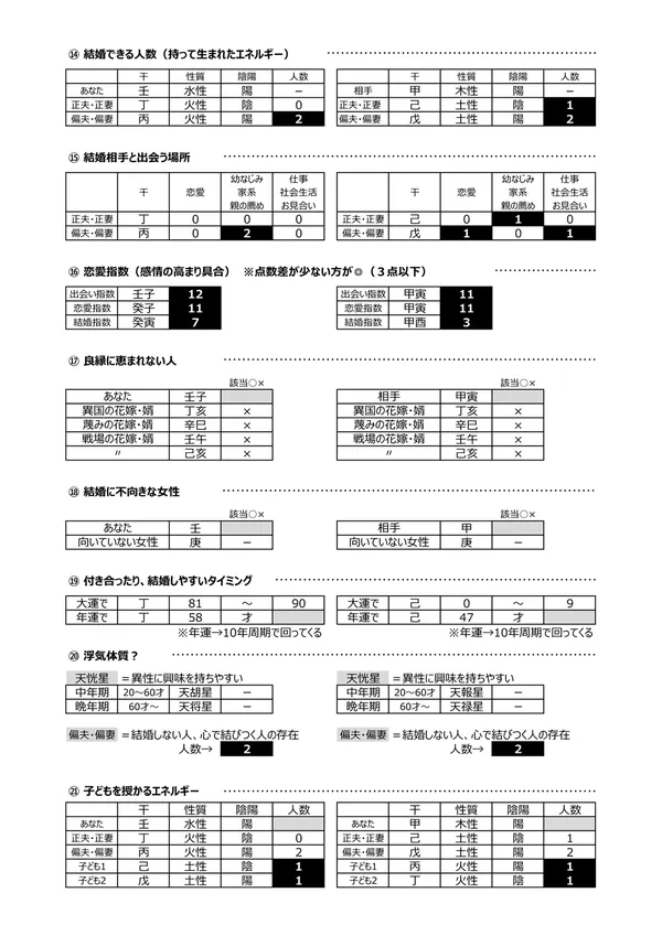 - M 結婚できる人数 → 生まれながらに結婚のエネルギーが有るかを知ることができます。「0」の人は、「1人でいた方が輝ける人」という見方をします。結婚後、違和感を感じたら、2人のために「早めのリスタート」をするか、家庭内に「1人になれる場所」を作ったりする必要があります ※「偏夫・偏妻」とは籍を入れない「内縁の夫・妻」などを示します 説明ページ