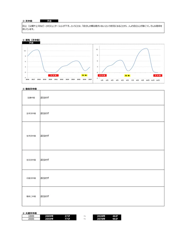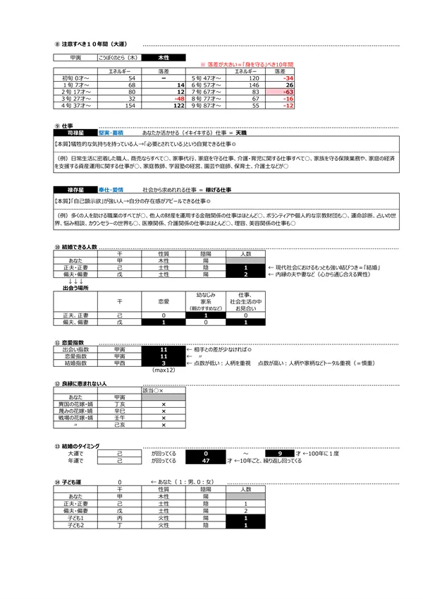 - B 生まれ持ったリスク → 「先祖から悪影響を受けてしまう」「他人に理解されない」「霊感が強い」など、宿命として背負ったリスク を知ることができます
