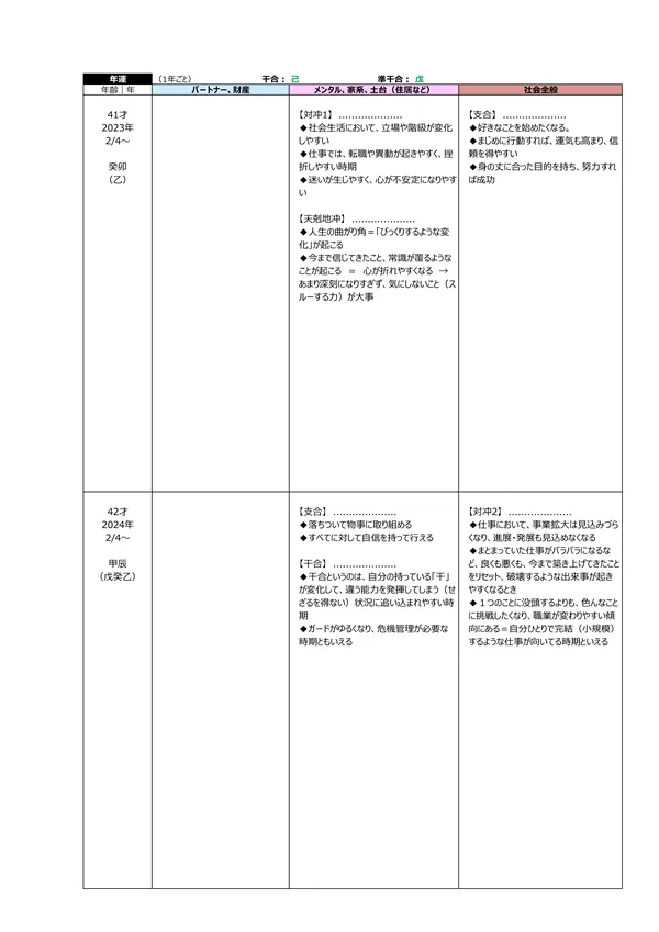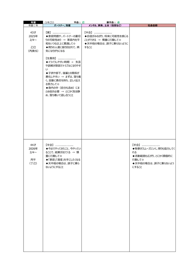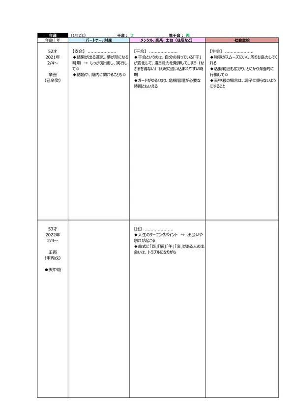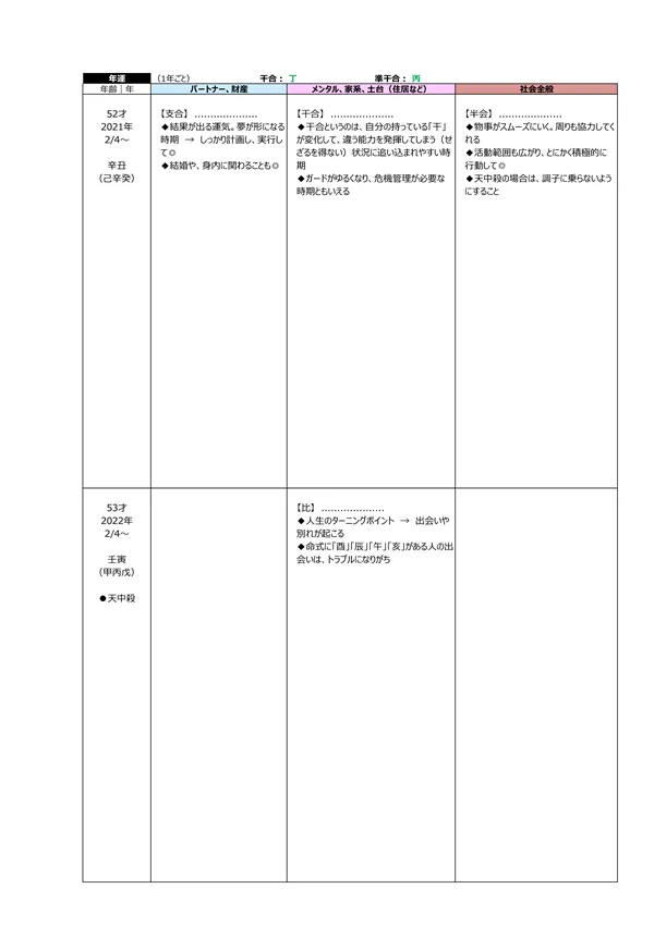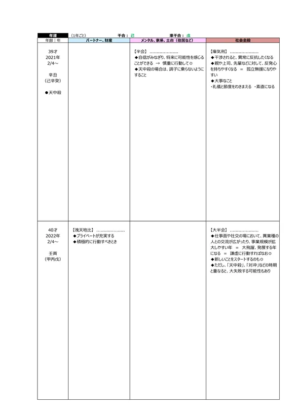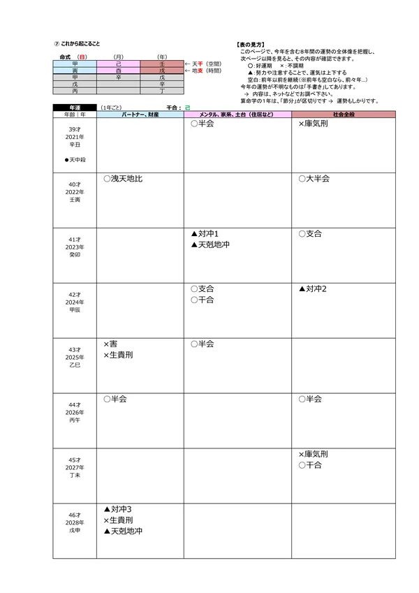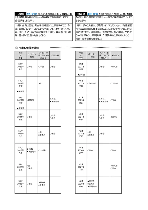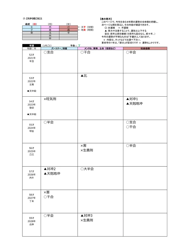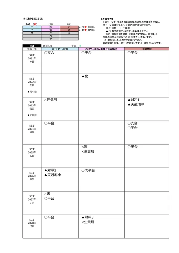- L 今後5年間の運勢 → 自分の命式(1ページ目)と、毎年の「干支」がどのような影響を及ぼすかによって、運勢を予測できます。この表によって全体像(○:良い ▲:本人次第 ×:悪い)が分かります。また、「空白」の箇所は「前年、前々年」の運勢を継続するように見ていきます ※それぞれの「運勢」の内容は、個々の鑑定書で見ることができます。