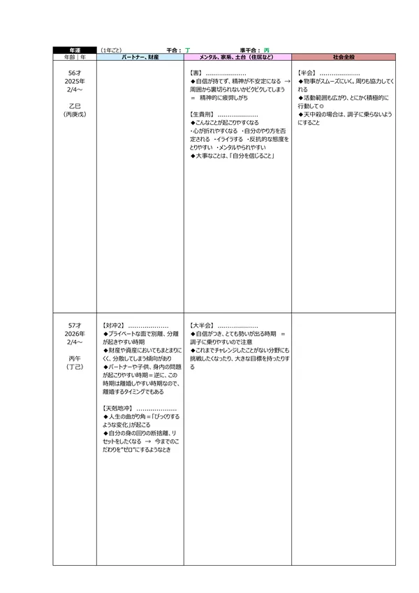 - P 良縁に恵まれない人(結婚しても幸せになれない人) → 日干支(命式1ページ目の水色)が、4種類「丁亥・辛巳・壬午・己亥」に該当する場合。どうすればよいか?→相手の家系に近づかない(ほどほどに付き合う) 説明ページ