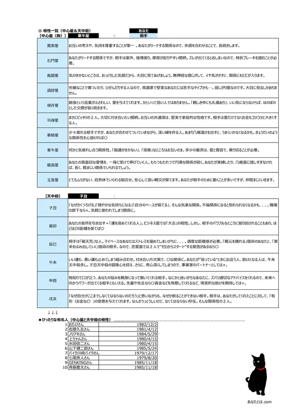 - D 相性診断 → 「中心星」と「天中殺」から相性が分かります ※相性が良過ぎると、何もかも分かり合える反面、「何でも見透かされてしまう」 息の抜けない関係にもなりかねません…